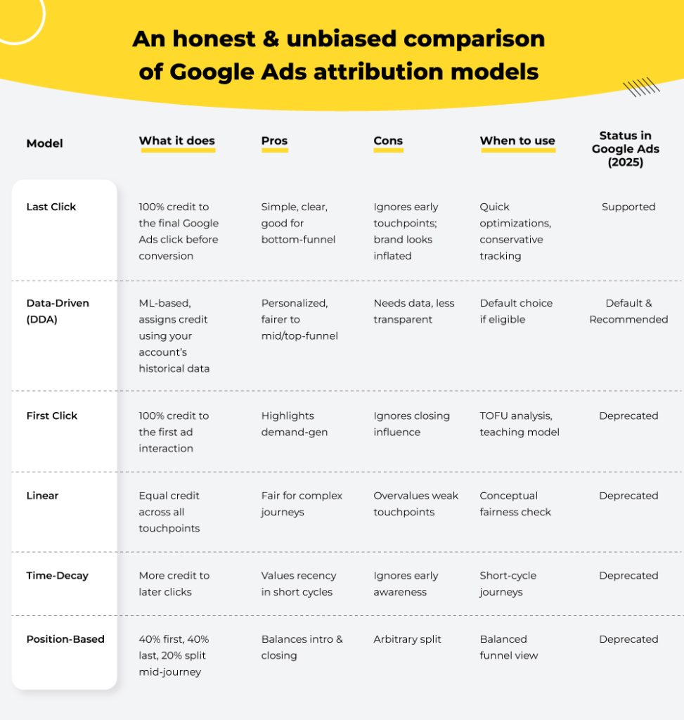 Here’s a table we keep handy whenever attribution questions come up. It outlines how each model works, its pros/cons, and whether it can still be used in Google Ads. Now you might wanna bookmark this!